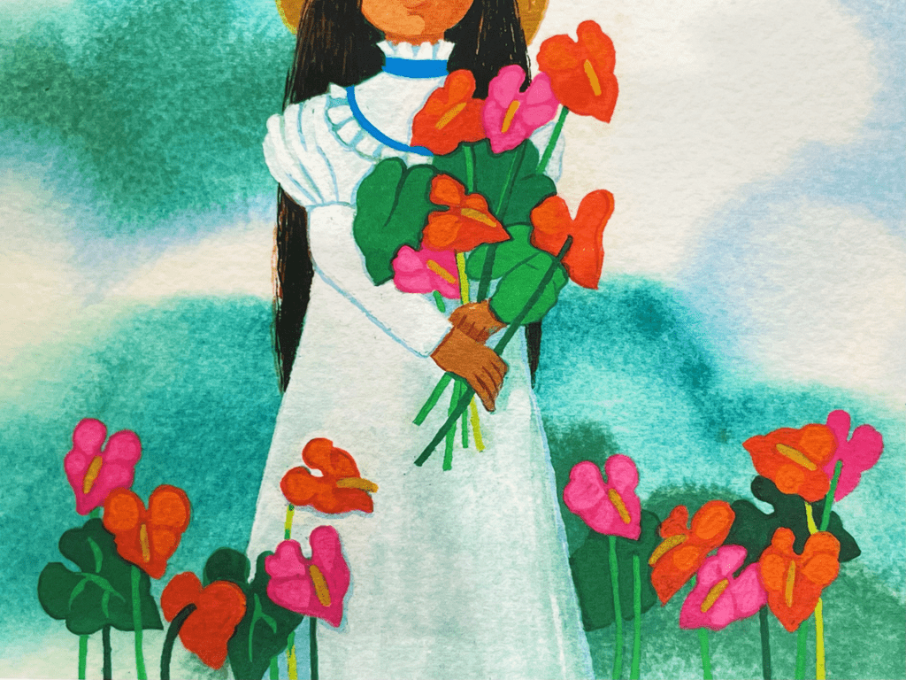 女の子が腕いっぱいに抱きかかえているお花は「アンスリウム」というお花です。